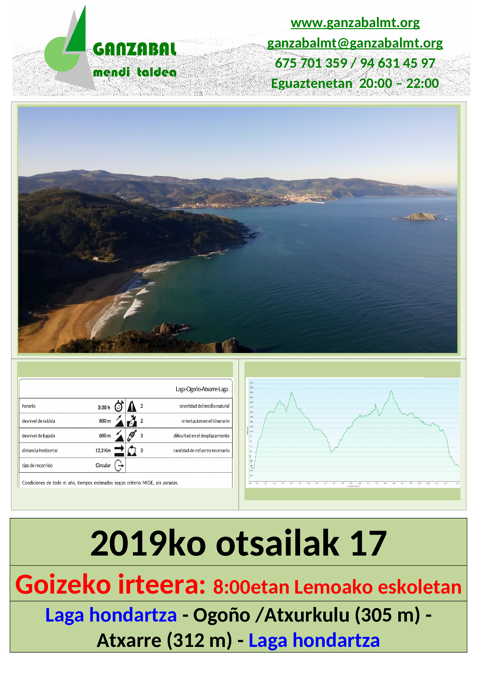 17 de febrero, » Salida mañanera (Playa de Laga – Ogoño / Atxurkulu – Atxarre – Playa de Laga)» a las 8:00 en las escuelas de Lemoa.