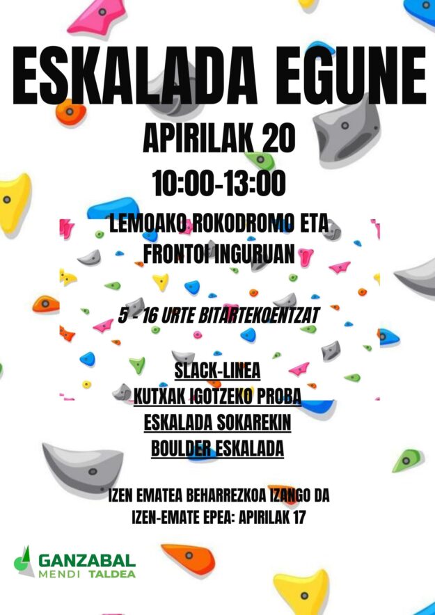 · Izena ematea: apirilak 17 (19:30etatik 21:00etara lokalean edo 675 701 359 zenbakira deituz. · SLACK-LINEA – KUTXAK IGOTZEKO PROBA – ESKALADA SOKAREKIN – BOULDER ESKALADA · Orduegia: 10:00-13:00 · 5-16 urte bitartekoentzat