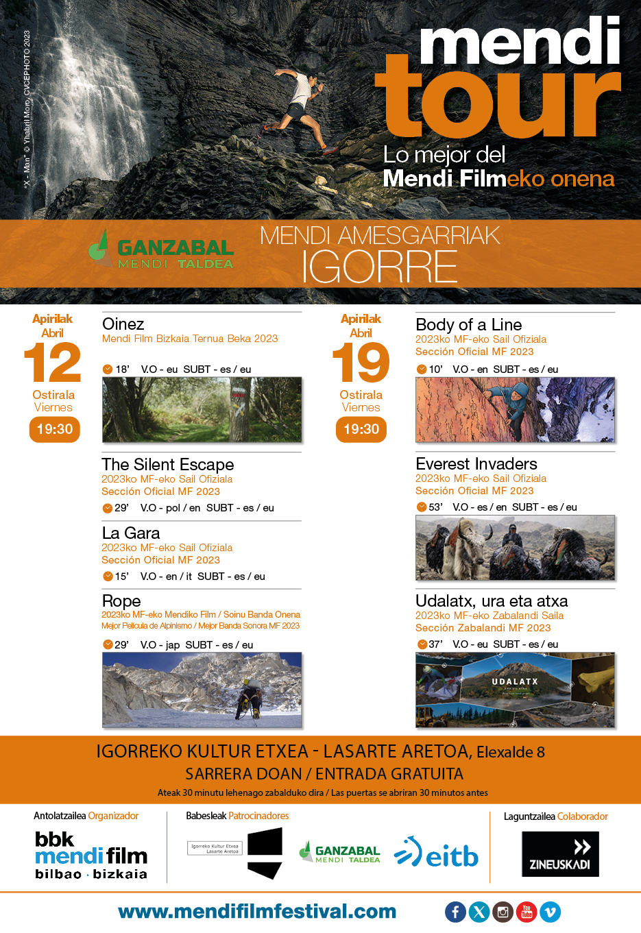 2024ko apirilak 12-19 “Mendi amesgarriak, mendi tour, Mendi Filmeko onena” Igorreko Lasarte aretoa, 19:30.