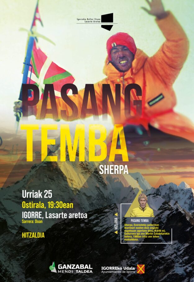 HITZALDIA: PASANG TEMBA SHERPA (Sherpa, Everesteko gailurrean ikurrinari eusten dion argazki ospetsuan agertzen dena (8.848 m). Gailurrera igo zen Martin Zabaletarekin batera, 1980an iritsi zen lehen euskalduna. Igorreko Lasarte aretoan arrastiko 19:30an (sarrera doan).