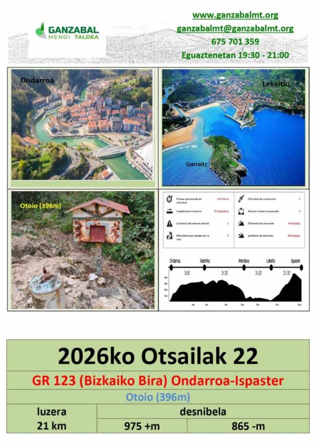 Informazioa PDF-an: https://www.ganzabalmt.org/wp-content/uploads/2026/02/GR-123-Etapa-10-Ondarroa-Ispaster-check-list.pdf Mapak:https://www.ganzabalmt.org/wp-content/uploads/2026/02/GR-123-Etapa-10-Ondarroa-Ispaster-mapa.pdf Track-ak:https://www.bizkaia.eus/eu/gr123/etapa/-/asset_publisher/ANte0czxRqC8/content/etapa-10-ondarroa-ispaster/880303