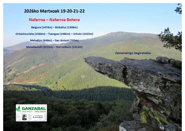 Informazioa PDF-an: https://www.ganzabalmt.org/wp-content/uploads/2026/02/Nafarroa-Nafarroa-Behera-check-list.pdf Track -ak: https://es.wikiloc.com/rutas-senderismo/abaurregaina-baigura-1474m-bizkailuz-1308m-garaioa-250793923 https://es.wikiloc.com/rutas-senderismo/orreaga-ortzantzurieta1566m-txangoa1466m-urkulu1423m-orbaizetako-ola-250868250 https://es.wikiloc.com/rutas-senderismo/mehaltzu-648-m-eta-san- antoni-muskildi-705-m-saint-just-ibarreetik-abiatuta-250998427 https://es.wikiloc.com/rutas-senderismo/auritz-mendiaundi-iturrunburu-urkiagako-mta-251069549 Mapak: https://www.ganzabalmt.org/wp-content/uploads/2026/02/Abaurregaina-Garaioa.mapa_.pdf https://www.ganzabalmt.org/wp-content/uploads/2026/02/Orreaga-Orbaitzetako-Ola.mapa_.pdf https://www.ganzabalmt.org/wp-content/uploads/2026/02/mehaltzu-saint-just-ibarreetik-abiatuta.mapa_.pdf https://www.ganzabalmt.org/wp-content/uploads/2026/02/Auritz-Urkiagako-mendata.mapa_.pdf