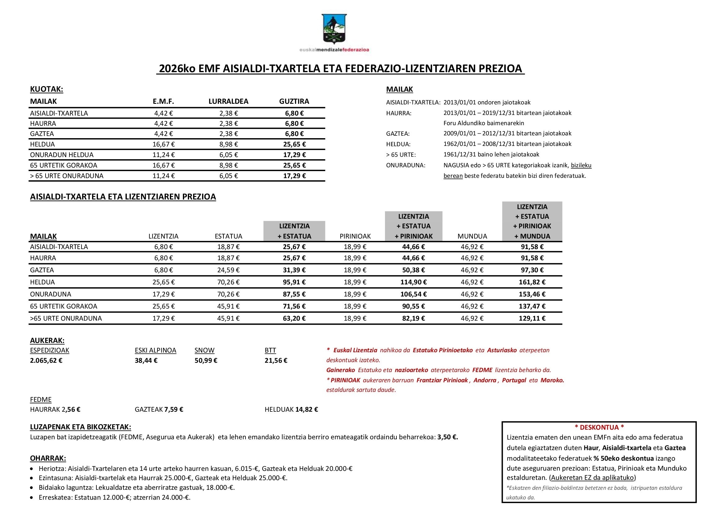• Gogoratu 2026 denboraldi honetan Generali aseguruarekin jarraitzen dugula. Pirinioak aukera kontratatuz gero, Maroko osoa egongo da estalita. Bestalde, lizentzia ematen den unean EMFn aita edo ama (ez du balio beste edozein ahaidetasun-motak) federatua dutela egiaztatzen duten haur, aisialdi-txartela eta gaztea modalitateetako federatuek %50eko deskontua izango dute aseguruaren prezioan: Estatua, Pirineoak eta Munduko estalduretan. (Aukeretan EZ da aplikatuko). Eskatzen den filiazio-baldintza betetzen ez bada, istripuetan estaldura ukatuko da.Kontuan izan deskontu hori aseguruaren prezioari aplikatzen zaiola soilik, ez lizentziaren prezioari.